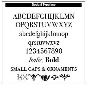 The typeface that retained the Bodoni name appeared in 1790. Of the many books that he produced during this period, the best known is his Manuale Tipografico (1788; “Inventory of Types”), a folio collection of 291 roman and italic typefaces, along with samples of Russian, Greek, and other types.” (Britannica)