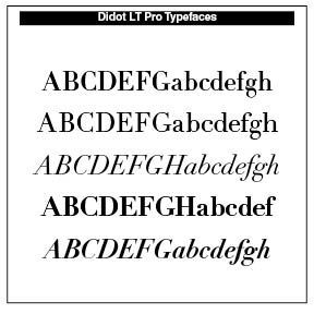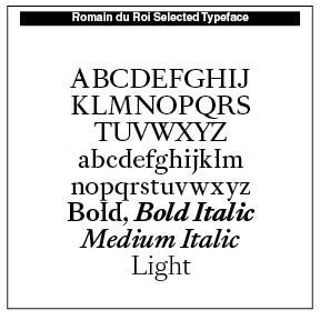 The Romain du Roi had serifs on both left and right sides at the top of ⟨b, d, h, i, k, l⟩. ⟨l⟩ had an extra serif to the left at the mean line to distinguish it from capital ⟨I). It has 108 variations, with Thin, High, Light, Medium, Bold and all the Italics. A sample is noted here. Precision and poetic elegance moves us typographically forward in these faces.