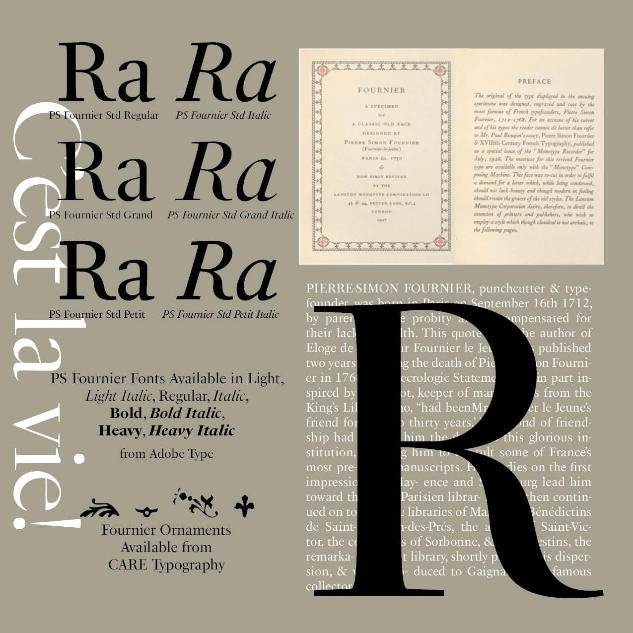 Fournier's work in type design focused on creating typefaces that were both visually appealing and functional. His types were characterized by their clarity, beauty, and legibility. The typeface Fournier is an aristocratic roman typeface. It is transitional, almost modern, in character, with a distinct French flavor, but with more grace and style than traditional French oldstyle designs. This modern character influenced the later work of Bodoni.