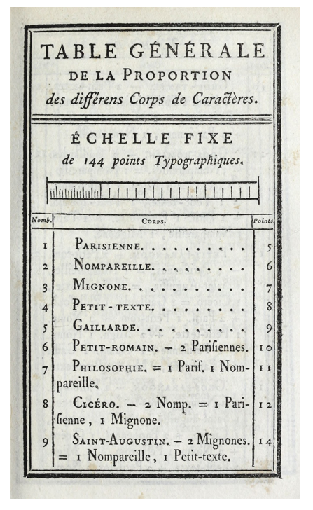 Firmin Didot (1761–1853) assumed responsibility for his father’s, Francois–Ambroise Didot’s (1730–1804), typefoundry. Francois-Ambroise “altered the standard of type design by allowing greater contrast between thick and thin letters. He improved upon the Fournier standard of measurement for punch cutting and mold making; the Didot point system of 72 points to the French inch became the standard unit of type measurement.” (Britannica)