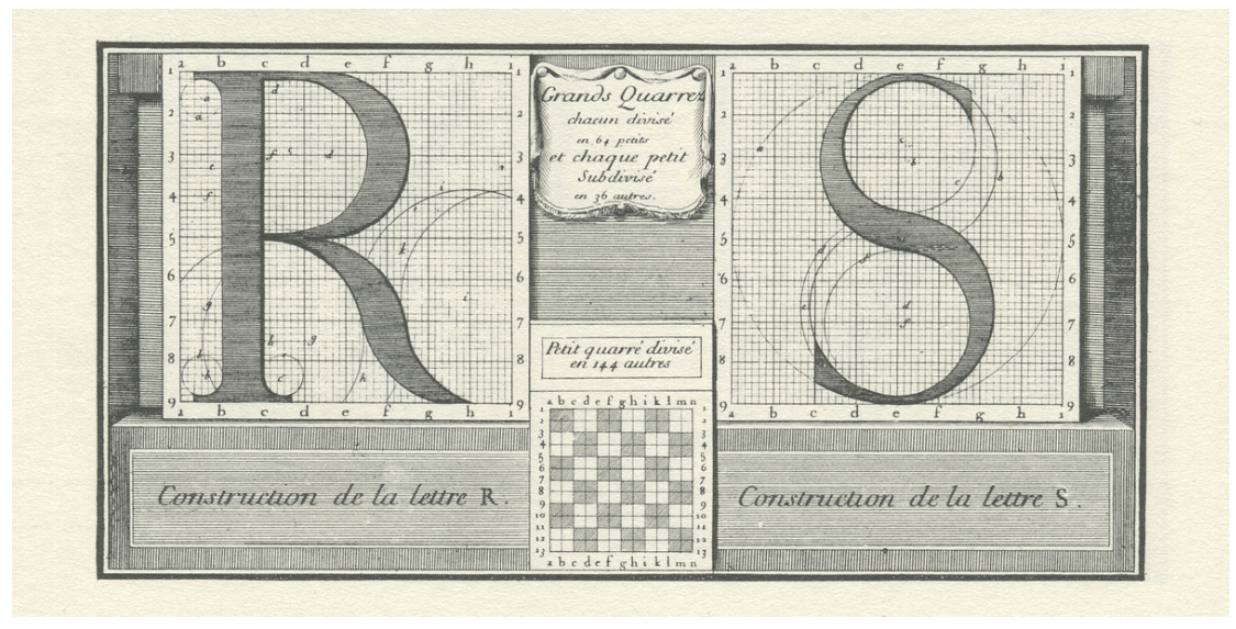 A commission consulted the most beautiful books, the authoritative manuals, as well as many collections and type specimens, identifying the best that has been done since the origins of the printing press. It examined the incunabula of Mainz, Rome, Venice, Paris, the most beautiful printed books of the Angelier, the Estienne, the Wechel, the Elzevier, the theoretical treatises of the géométriciens de la lettre (letter geometricians)— Luca Pacioli, Sigismondo Fanti, Albert Dürer, Geoffroy Tory, Ludovico degli Arrighi, contemporary calligraphic collections, such as those of Louis Senault and Jean-Baptiste Alais, and so forth. The committee was particularly concerned with measuring the proportions between the different sizes of letters, following a numbering system very close to the typographic point. The proportion of the letters in their width is also the subject of precise calculations, apparently referring to the Romans of Jannon4 in large sizes owned by the Imprimerie royale. (https://typofonderie.com/gazette/le-romain-du-roi-the-exclusive-typeface-of-louis-xiv)