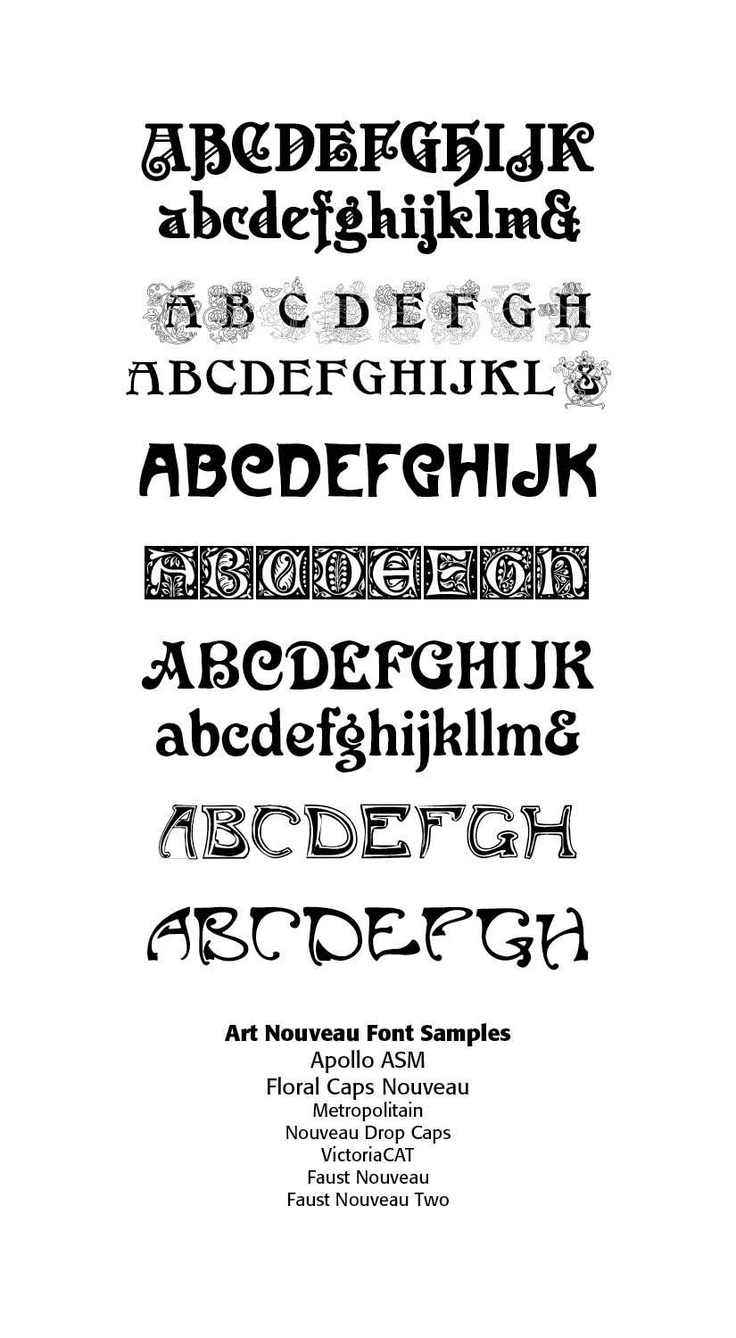 Other characteristics of Art Nouveau were a sense of dynamism and movement, often given by asymmetry or whiplash lines, and the use of modern materials, particularly iron, glass, ceramics and later concrete, to create unusual forms and larger open spaces. SEE SAMPLES and (SEE Blog “Art Nouveau Typography,” September 6, 2025)
