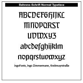 Behrens Schrift (1901-1902, Jugendstil font at the Rudhardsche foundry in Offenbach. This typeface served, for example, as the official German type for the world expositions in 1904 and 1910. This is a digitized sample.