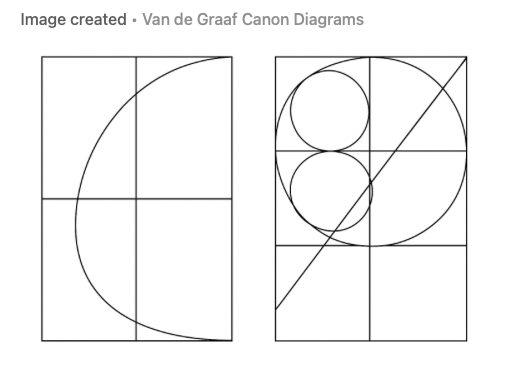 The Van de Graaf Canon is a geometric method for constructing ideal proportions for a book page and its text block. The “circles” refer to one of the visual/analytic diagrams used to illustrate the proportional relationships. Originating from the 15th-century book designs, it creates harmonious margins and places the text block within a page using geometric diagonals, not numerical measurements.