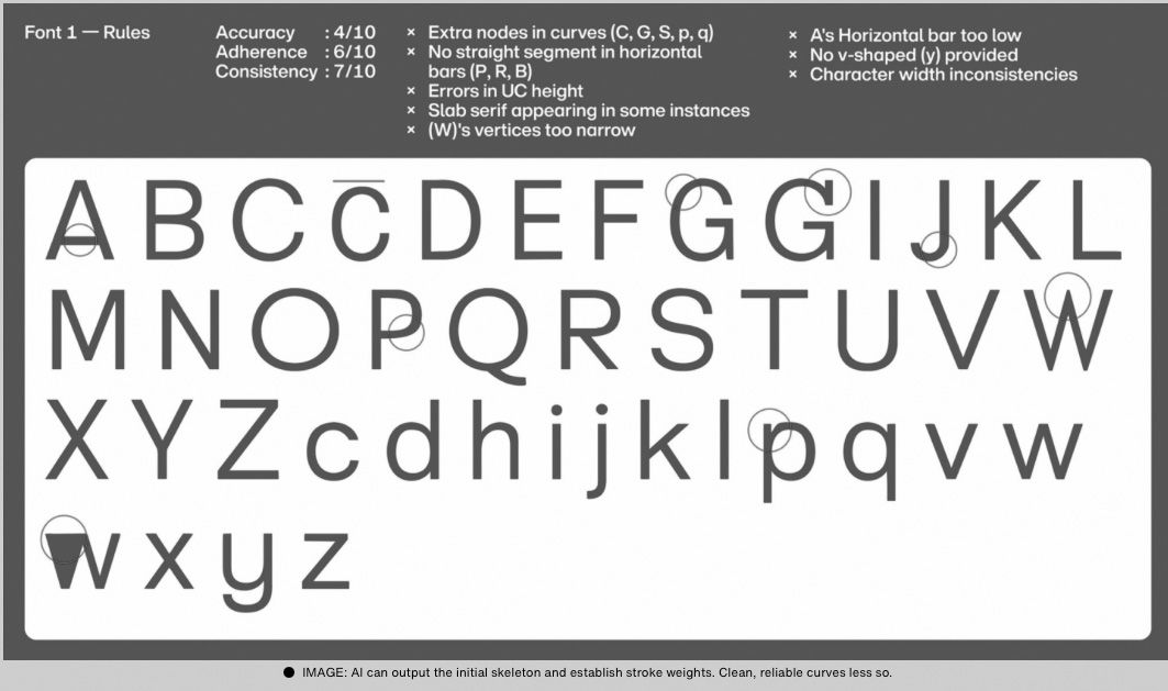 What Monotype found out in their reporting about AI now is that the technology is clearly lacking in typographical preciseness and artistic coherence. “But for better or for worse, it turns out that AI is fairly bad at drawing letters. In a recent piece in The Atlantic (a piece that, it should be noted, was sponsored by Google), writer Drew Campbell observed that while AI knows many words and may already know all the words there are to know, it “stumbles” when “creating the literal letterforms that construct each syllable, clause, and paragraph.” (Monotype and see “Typography Reconsidered,” Drew Campbell, The Atlantic at https://www.theatlantic.com/sponsored/google/typography-reconsidered/3886/)