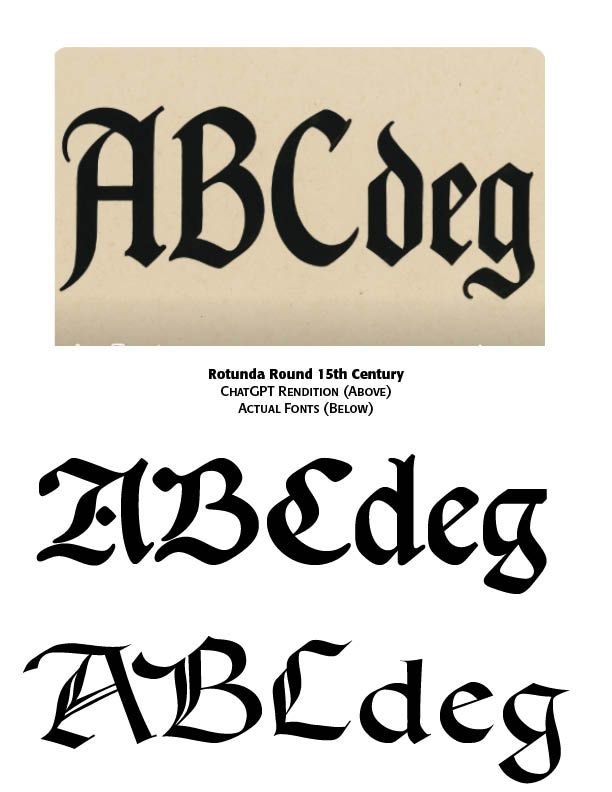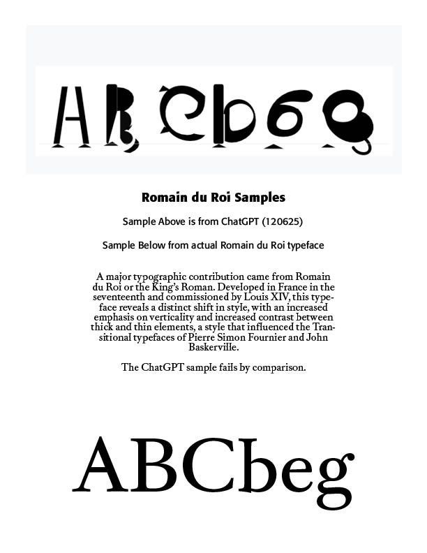 In my own experimentation with AI tools in typographic design, I asked ChatGPT to give me a typeface in Rotunda rounded Gothic type of the 15th century in the letters, ABCdeg. This is what it came up with. Looks “like” rounded Gothic, but not really. I also asked AI to give me those letters with the typeface of Romaine du Roi, a very carefully crafted typeface of the Enlightenment Period in the 1700s. It came up with these letters, a terrible rendering.