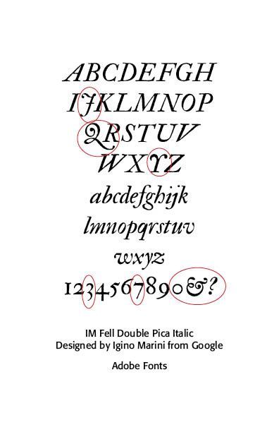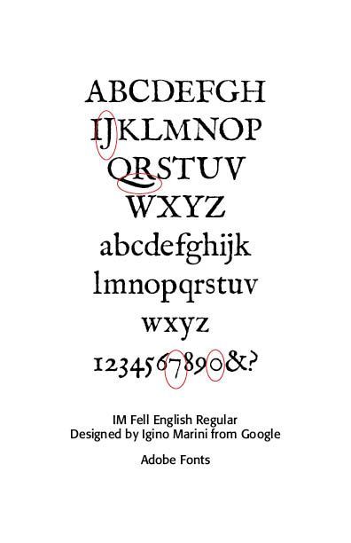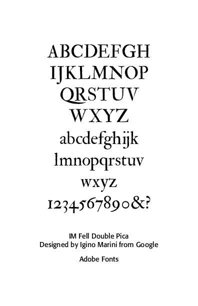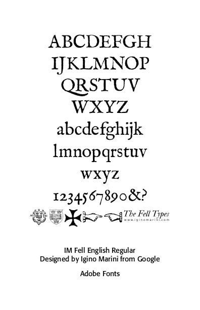The revived Igino Marini Fell fonts include IM Fell English, IM Fell French Canon, IM Fell Double Pica, and IM Fell Great Primer. These retain the irregularity and color of the originals, making them popular for historical and literary work.