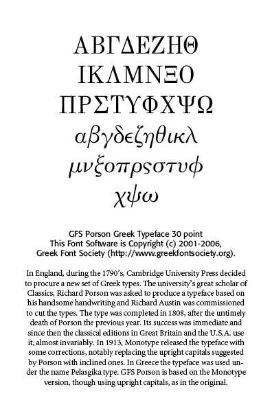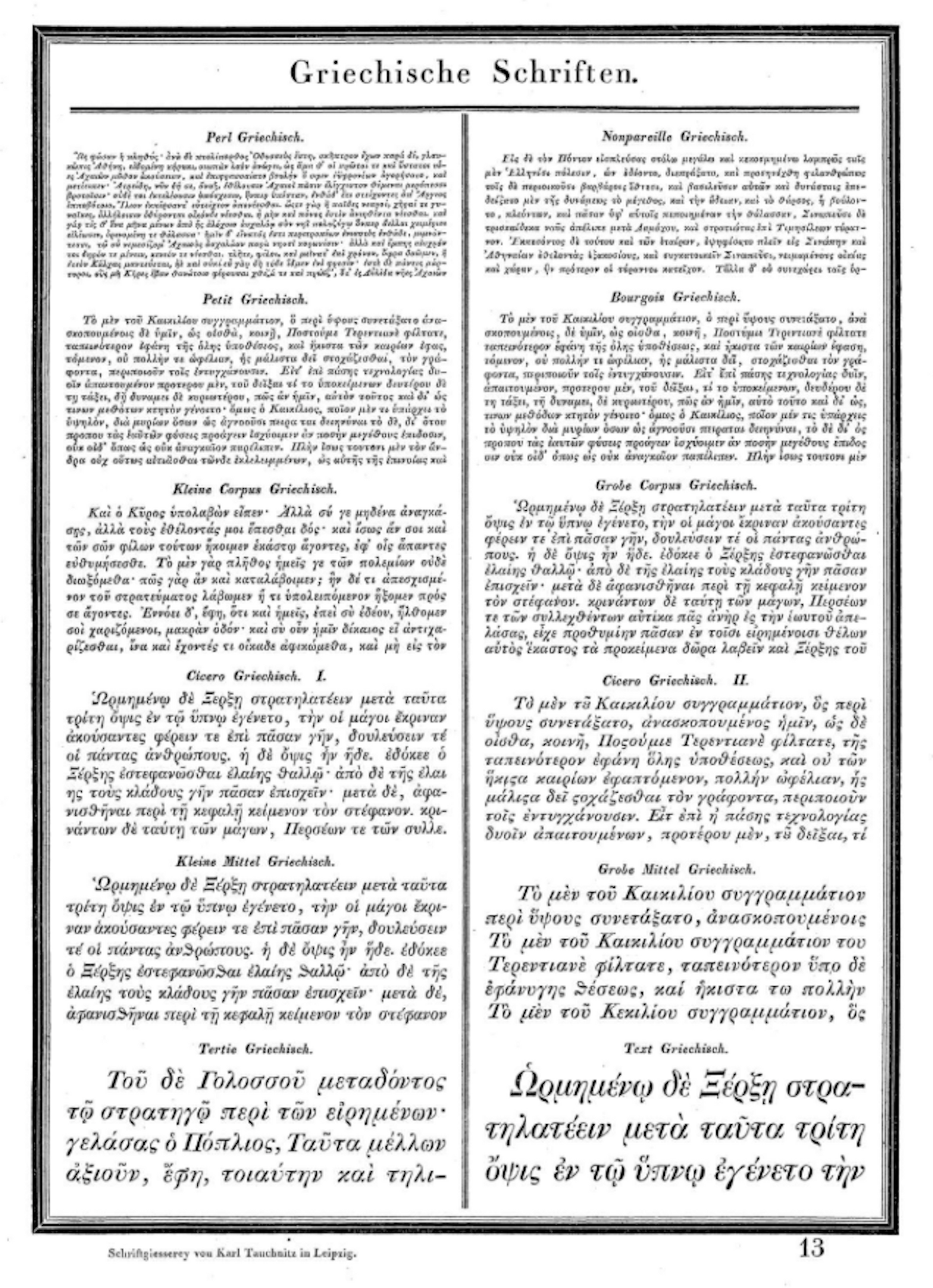 Predictably, it followed the prevailing neoclassical fashion of maximum contrast between thick and thin strokes of their contemporary Latin fonts. Cambridge University Press commissioned a mildly oblique font based on Prof. Richard Porson’s much admired hand-writing, Firmin Didot introduced an upright, round Greek font in Paris and Karl Tauchnitz in Leipzig reprised with his also round, but excessively inclined letterforms; those three distinct styles became the almost exclusive Greek type used in each respective country until the mid-twentieth century for every philological, archeological or theological edition.”[2]