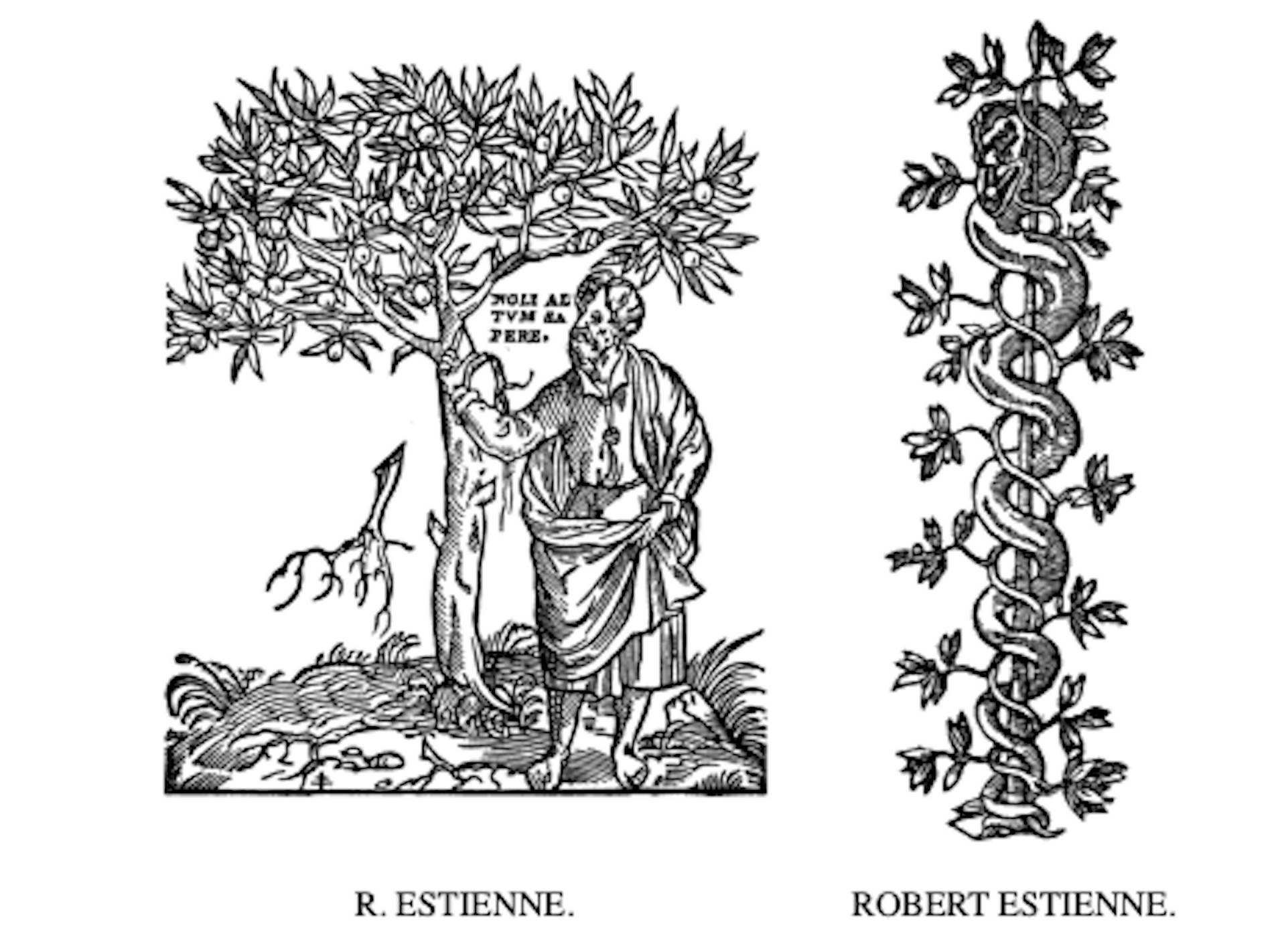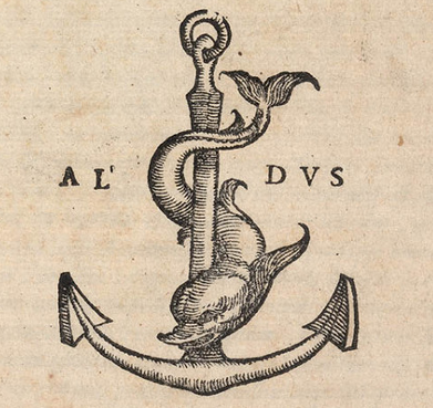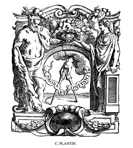 Many famous images and symbols originate from printers’ marks. The design used by Venetian printer Aldus Manutius depicts a dolphin wrapped around an anchor. The printer’s mark used by French printer Robert Estienne shows a man standing by an olive tree, symbolising the tree of knowledge. Christophe Plantin, in Antwerp, used a pair of compasses held by a hand extending from a bank of clouds, the compass points signifying labour and constancy.” [1]