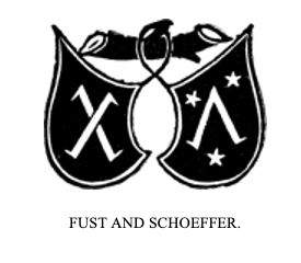 The earliest printer’s mark by Fust and Schoeffer in 1457 indicated a diagonal cross. It was placed as a colophon at the end of the Psalter printing, the second work of Gutenberg.