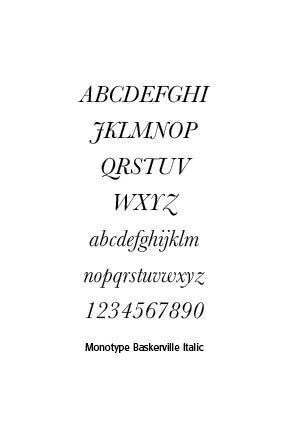 One of the most beautiful italic typefaces is Baskerville. Designed in 1757 by John Baskerville in Birmingham, England, Baskerville Italic demonstrates the outstanding qualities of harmony, precision and readability. “At a time when books in England were generally printed to a low standard, using typefaces of conservative design, Baskerville sought to offer books created to higher-quality methods of printing than any before, using carefully made, level presses, a high quality of ink and very smooth paper pressed after printing to a glazed, gleaming finish.”[5]