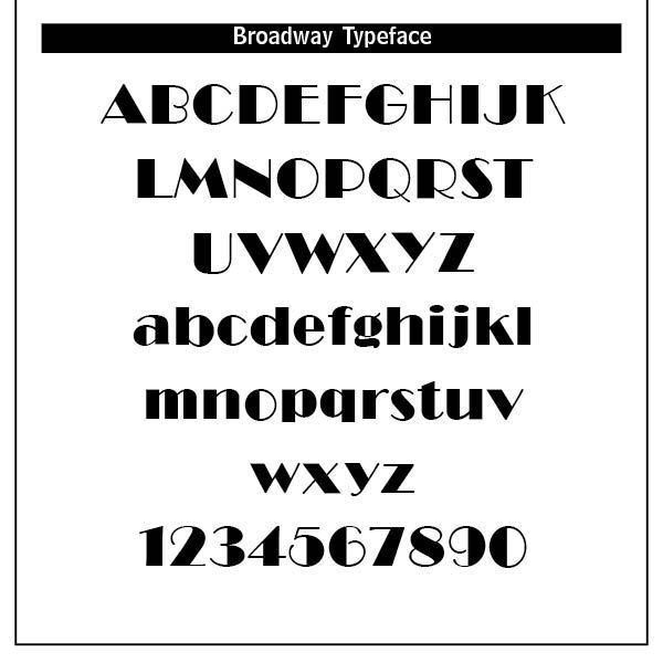 Art Deco marked the rise of display type — typefaces intended for large headings, signage, and advertising. Art Deco fonts like Broadway, Futura Display and Metropolis became iconic of the period. Note that the letterforms were stylized with angular, elongated lines, sharp corners, stepped forms and symmetrical embellishments. They were visually heavy, strong and yet, like the font Broadway, conveyed sophistication and style. Movie posters and theater marquees featured such typefaces.