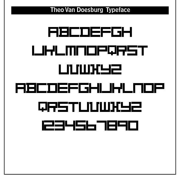 Typefaces that developed from De Stijl included Architype van der Leck designed by Bart van der Leck for the Dutch magazine Flax, a journal of the De Stijl art movement. Bart van der Leck was a Dutch painter and designer. With Theo van Doesburg and Piet Mondriaan he founded the De Stijl (abstract, geometric) art movement. In 1930, he was commissioned by Jo de Leeuw, owner of the prestigious Dutch department store Metz&Co. to design interiors, window packaging, branding and advertising. For these print materials van der Leck developed a rectilinear geometrically constructed alphabet