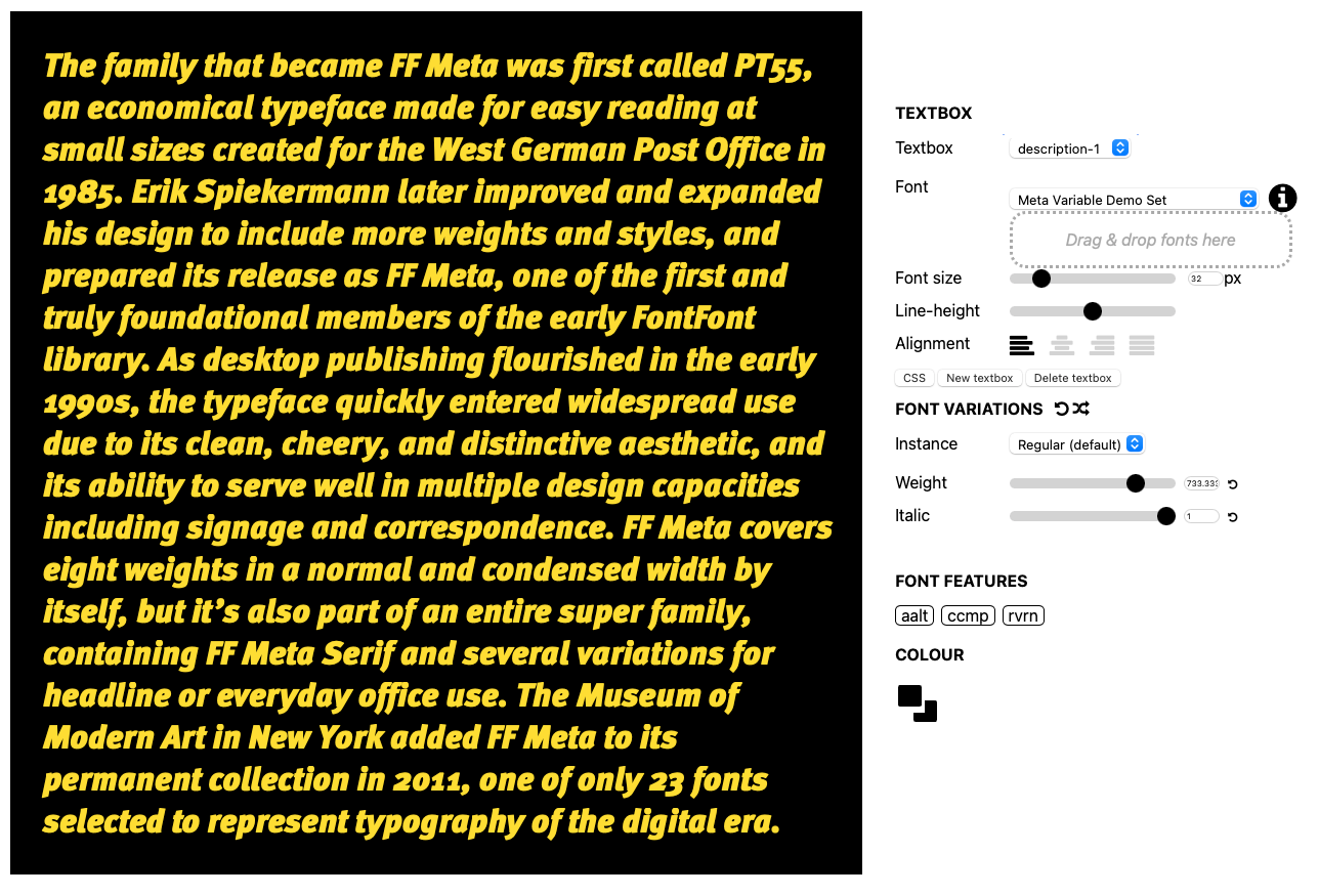 This is a sample Variable font, FF Meta Variable, noted in axis-praxis.org. Note the axes on the right of the paragraph.