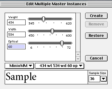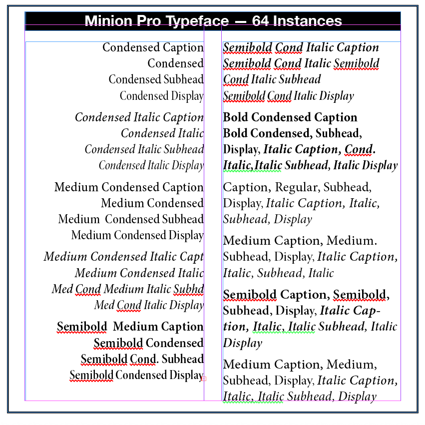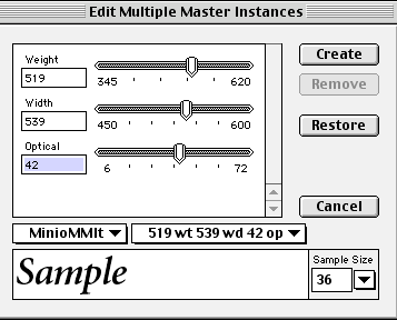 This technology failed for at least two reasons. First, users were forced to generate “instances” for each font variation, littering their hard drives with font bearing names, like MinioMMIt_519 wt 539 wd 42 op. This code was for the Minion Italic font with a weight of 519, a width of 539 and an optical size of 42.