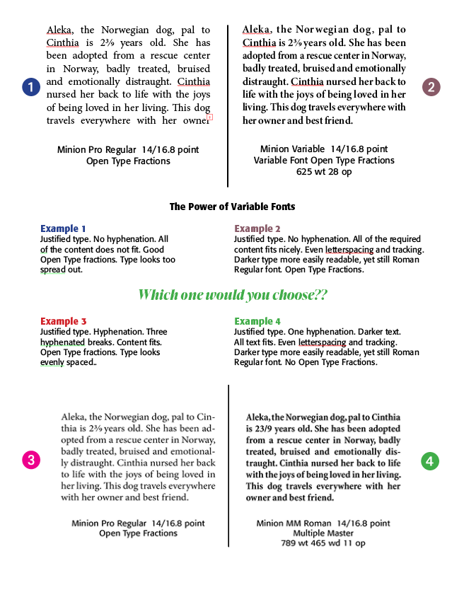 An Example. A client wants you to professionally typeset the following paragraph — "Aleka, the Norwegian dog, pal to Cinthia, is 2 3/9 years old. She has been adopted from a rescue center in Norway, badly treated, bruised and emotionally distraught. Cinthia nursed her back to life with the joys of being loved in her living. This dog travels everywhere with her owner." Her requirements are as follows — Use justified Minion type in a block 18 picas wide by 11 picas deep and in 14 point on automatic leading at 16.8 point. She wants you to use real fractions. The block must be easy to read and pleasing to the eye.