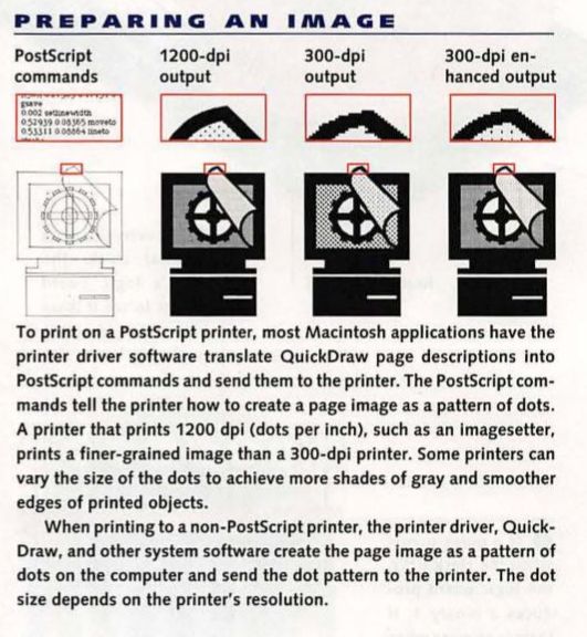 When you click OK in a Print Dialogue box on your computer, the application for text specifies font, size, style and so forth. For graphic objects, the application specifies the shape, size, line weight, fill pattern, and other attributes. QuickDraw prepares a script of actions necessary to draw the whole page and is generic enough to work with any type of printer. For the LaserWriter, the driver translates the QuickDraw script into a Postscript program and sends that to the printer.